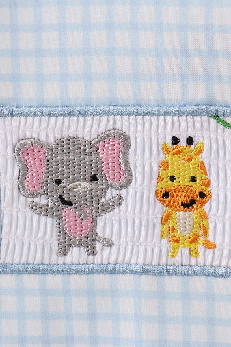 Blue animal smocked gingham romper