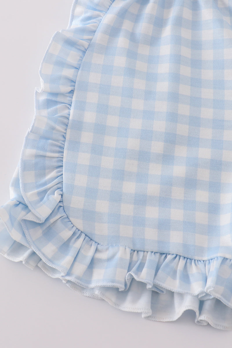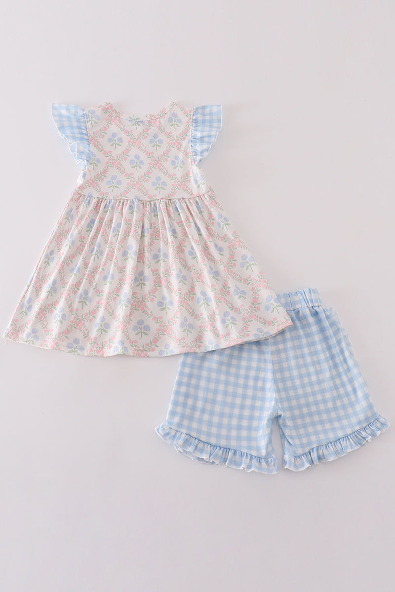 Get your little fashionista ready for summer with this blue hydrangea print girl set. Featuring a playful floral design, this set is perfect for any fun occasion. Let her embrace her unique style with this quirky and cute outfit. (Warning: may cause excessive twirling and cute overload!)