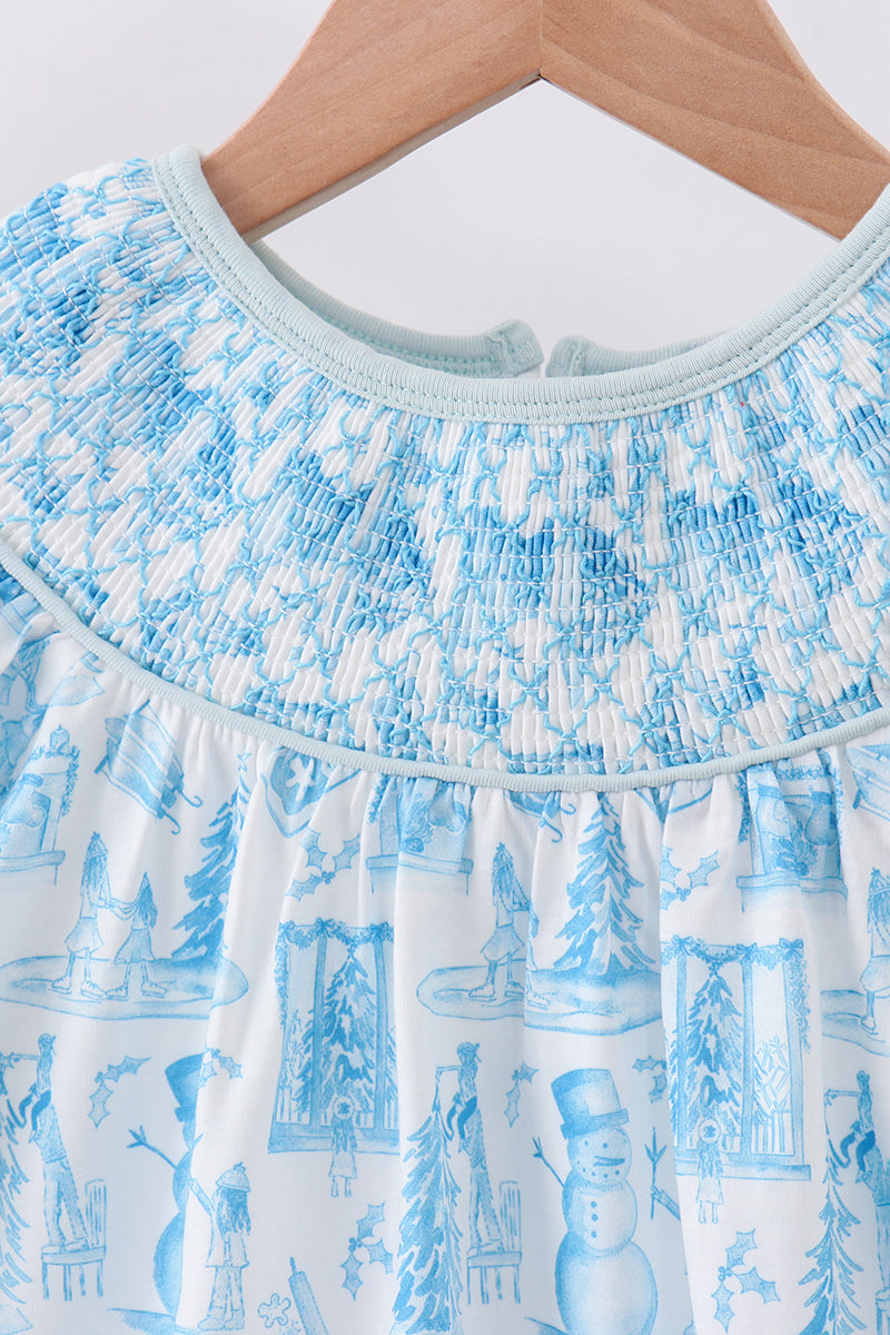 Get your little one holiday-ready with this playful Blue Snowman Christmas Tree Smocked Ruffle Pants Set. Featuring festive snowman and tree designs on a cozy blue fabric, the smocked top adds a snug fit while charming ruffle details bring extra cuteness. Perfect for spreading holiday cheer in style and comfort all season long.