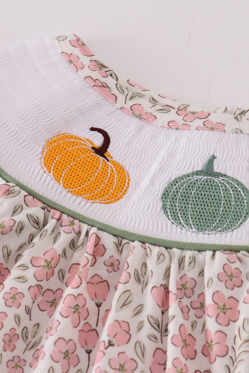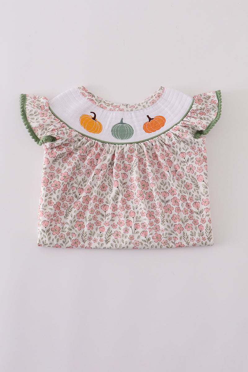 Add a splash of whimsy to your little one’s wardrobe with this pink pumpkin smocked floral ruffle pants set. Soft smocking ensures a comfy fit, while delicate floral prints and playful ruffles bring charm and movement. Perfect for twirling, playing, and making every day a little more magical.