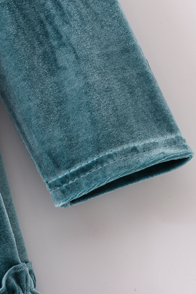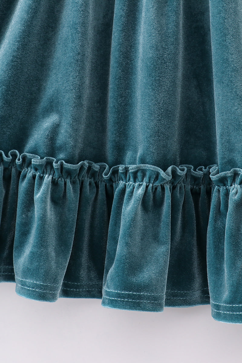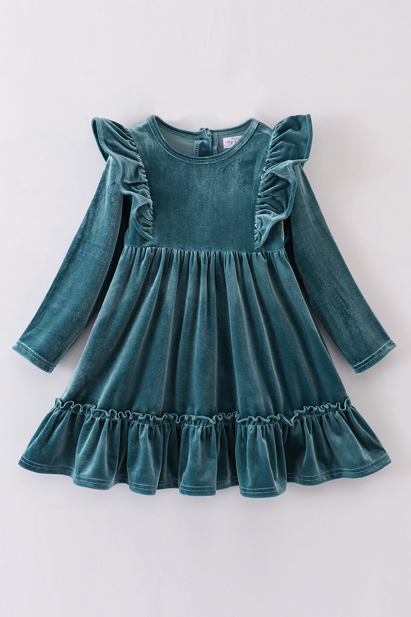 Add some texture and fun to your wardrobe with this teal velvet ruffle dress. Perfect for any occasion, this dress will make you stand out in all the right ways. Upgrade your style game with this unique and playful piece.(Playful, quirky, and humorous tone)
